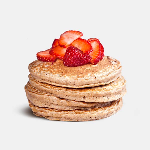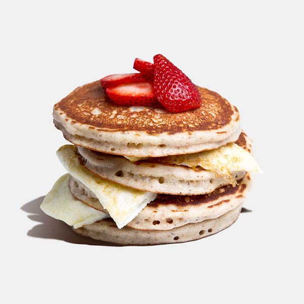 Scratch-Made Protein Pancakes layered with 6 Egg Whites. Topped with one Strawberry.