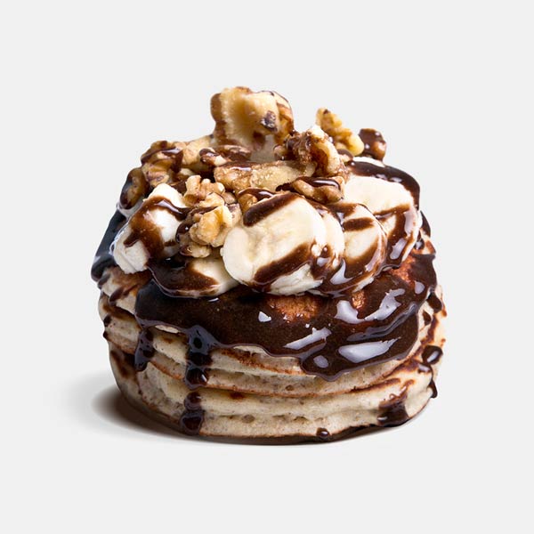 Scratch-Made Protein Pancakes infused with Dark Chocolate Chips. Topped with Banana, Walnuts and Sugar-Free Chocolate Protein Sauce.