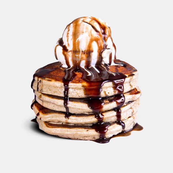 Scratch-Made Protein Pancakes. Topped with Vegan Vanilla Ice Cream and Sugar-Free Chocolate Protein Sauce.