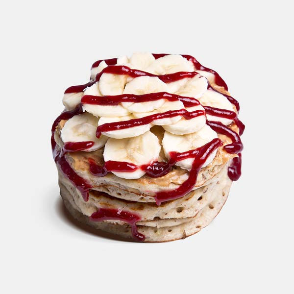 Scratch-Made Protein Pancakes. Topped with Peanut Butter, Banana and Homemade Sugar-Free Jelly.