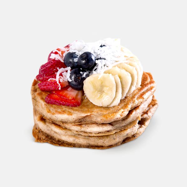 Scratch-Made Protein Pancakes. Topped with Coconut Flakes and your choice of fruit: Banana, Coconut, Blueberries, Strawberries or all together.