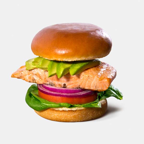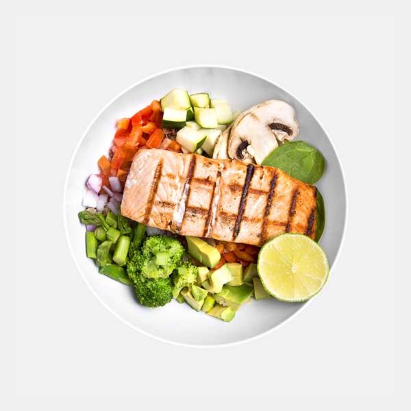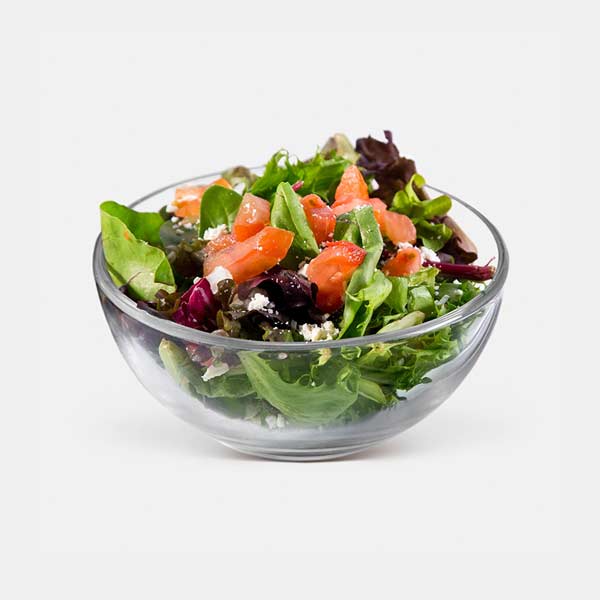 Sustainable and Responsibly Sourced Salmon*, Avocado, Asparagus, Zucchini, Tomatoes, Mushrooms, Broccoli, Spinach, Red Peppers, Red Onions, Cilantro Lime Vinaigrette.