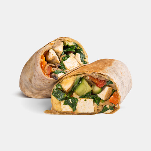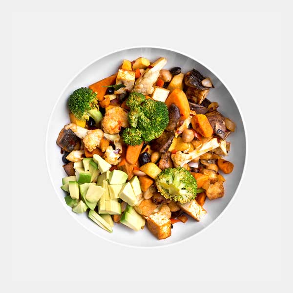 Organic Tofu, Grilled Portobello Mushroom, Avocado, Sweet Potatoes, Quinoa, Red Peppers, Broccoli, Cauliflower, Black Beans, Chickpeas, Red Onions, Minced Garlic, Red Pepper Flakes, Sriracha Sauce.