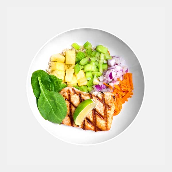 Grilled Sustainable and Responsibly Sourced Salmon*, Pineapple, Carrots, Celery, Spinach, Red Onions, Housemade Teriyaki Sauce.