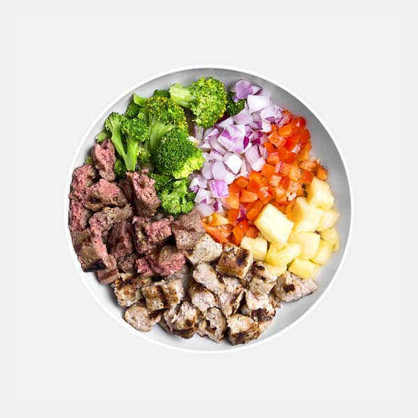 Turkey Patty (ABF), Grass-Fed Bison*, Pineapple, Broccoli, Red Peppers, Red Onions.