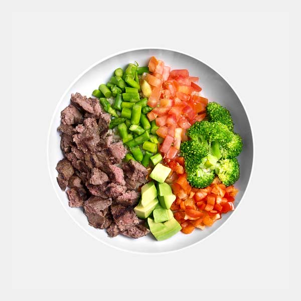 Grass-Fed Bison*, Avocado, Asparagus, Broccoli, Tomatoes, Red Peppers.