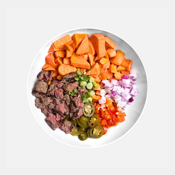 Grass-Fed Bison*, 6 Egg Whites*, Sweet Potato Rounds, Celery, Red Peppers, Red and Green Onions.