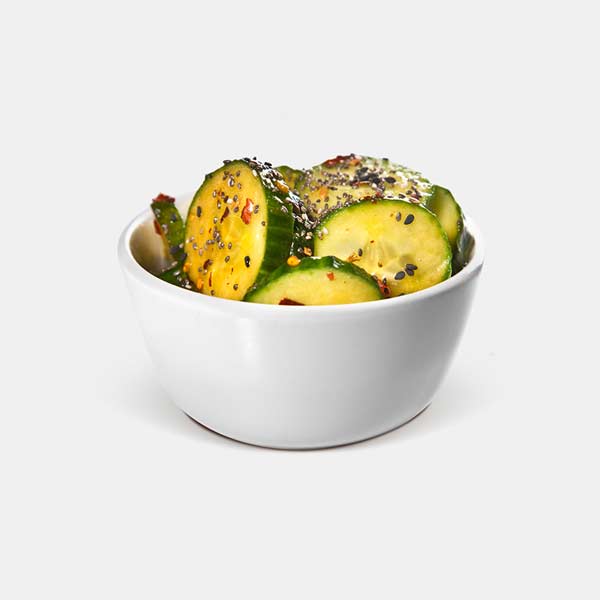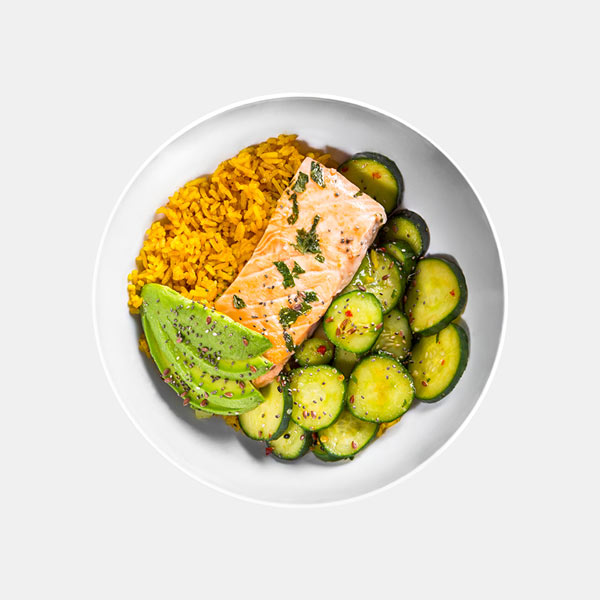 Sustainable and Responsibly Sourced Salmon*, Healing Turmeric Rice, Persian Cucumber Salad. Topped with Avocado, Flax Seeds, Chia Seeds and Chimichurri Sauce.